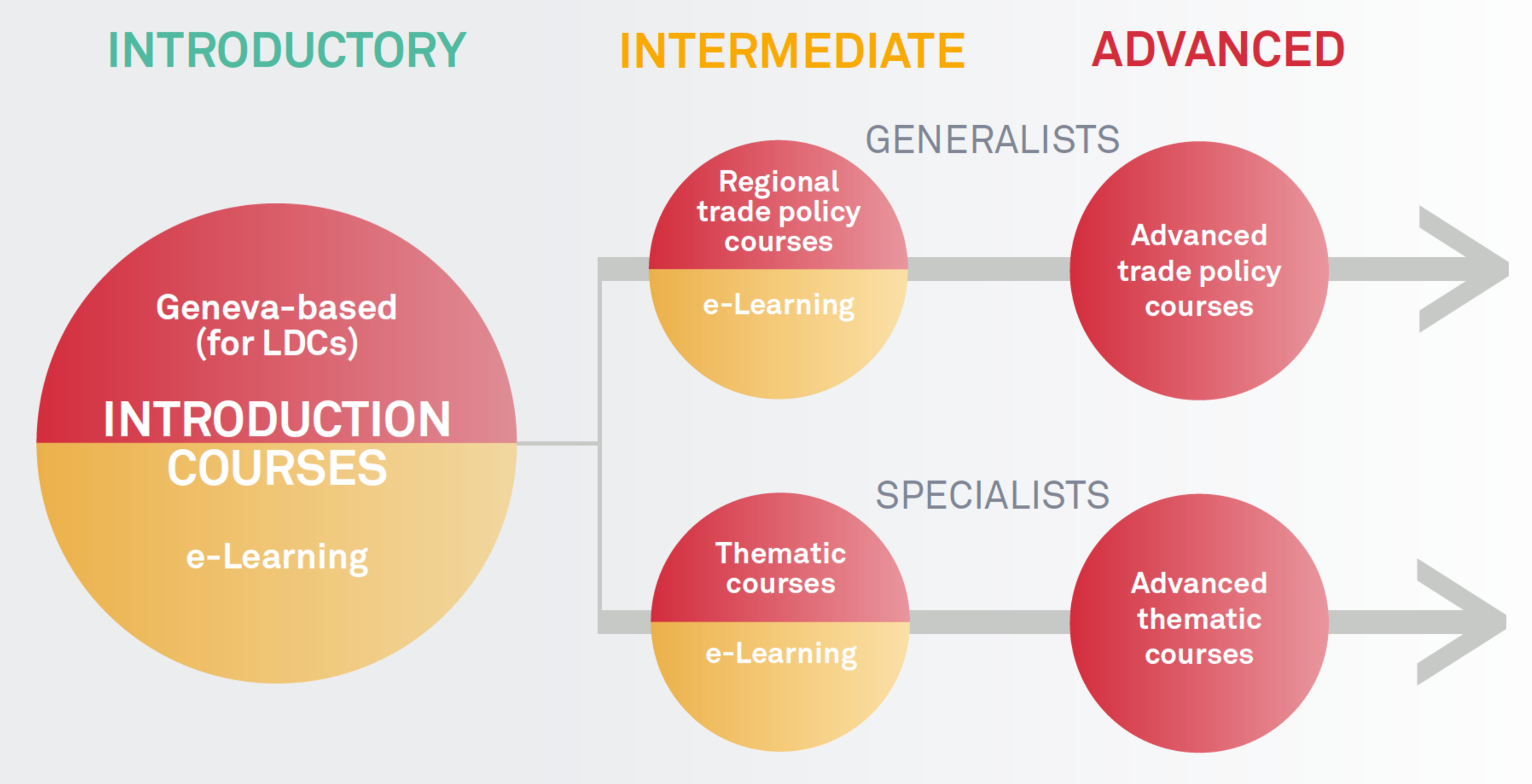 Our e-Learning courses are designed to align with the WTO's Progressive Learning Strategy (PLS), offering targeted training at basic and intermediate levels. The courses are structured into two complementary learning paths: "Generalists," providing a broad understanding of WTO and trade issues, and "Specialists," offering in-depth expertise in specific trade topics. This dual approach ensures a comprehensive, flexible learning experience for our audience, addressing both foundational and specialized knowledge needs.